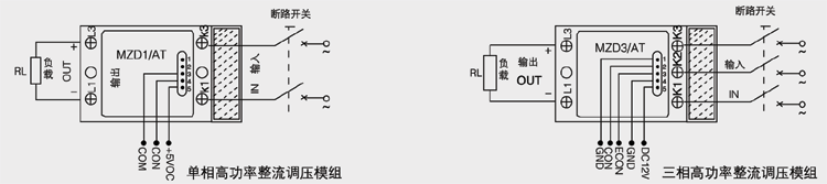 2、 单相整流调压模组:K1、K3端为负载交流电源输入端,L1、L3端为输出负载直流端。(注意正、负极)